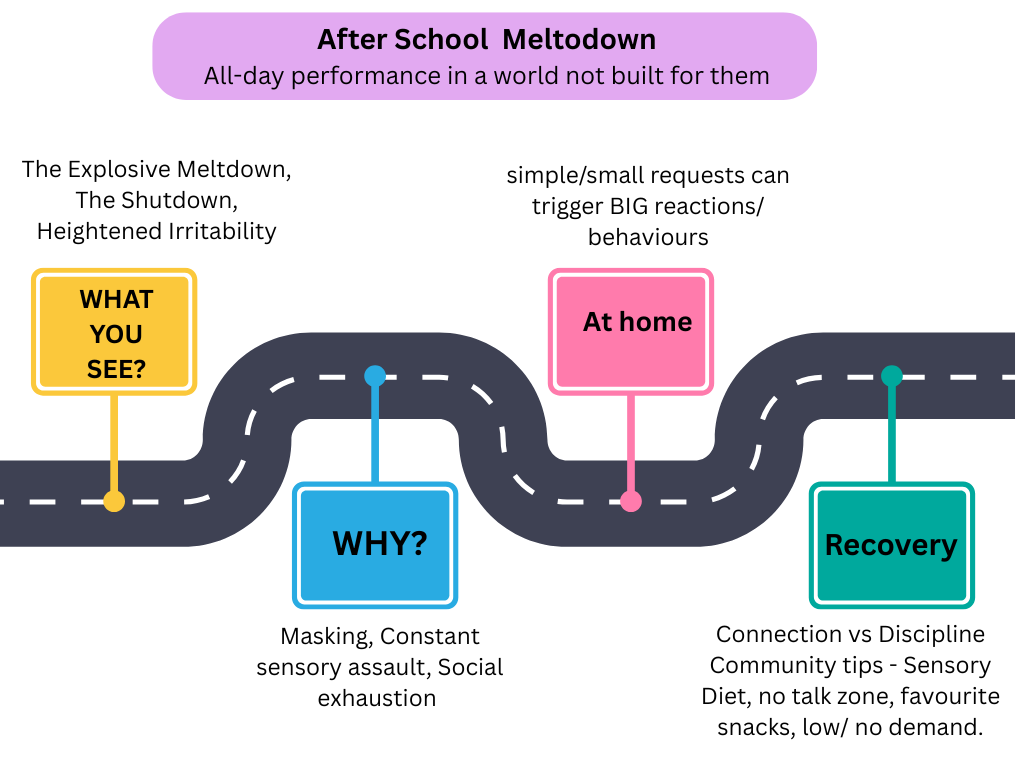 The tears, the yelling, the meltdown over a broken biscuit the moment you walk through the door. If this sounds familiar, you are not a bad parent, and it’s not a tantrum. It’s called After School Meltdown—and it’s a sign that your child feels safe enough to let go. In this post, we explore why neurodivergent children struggle so much after school, and how to create a “no-questions-asked” zone that helps everyone reset.